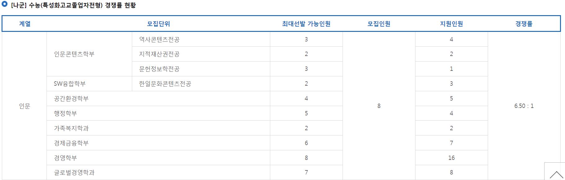[나군] 수능(특성화고교졸업자전형) 역시도 인문, 자연&예체능을 나누어 학과를 통합해 학생을 모집했으며, 인문은 6.50:1, 자연&예체능은 4.18:1 이었습니다.