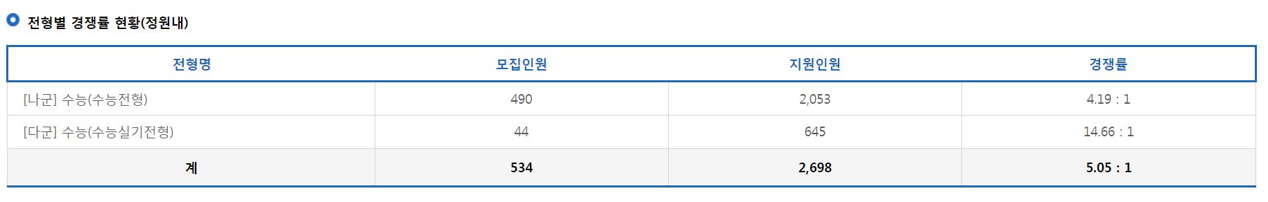 정원내 전형별 경쟁률을 먼저 살펴보자면, [나군] 수능(수능전형) 경쟁률은 4.19:1, [다군] 수능(수능실기전형) 경쟁률은 14.66:1 이었습니다.