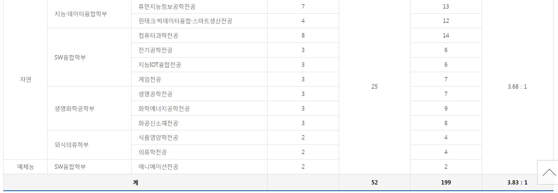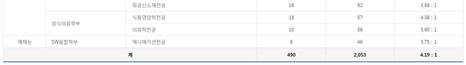 [나군] 수능(농어촌학생전형)은 인문학부, 자연학부&예체능을 각각 통합모집했으며, 인문의 경쟁률은 3.96:1, 자연&예체능의 경쟁률은 3.68:1 이었습니다.