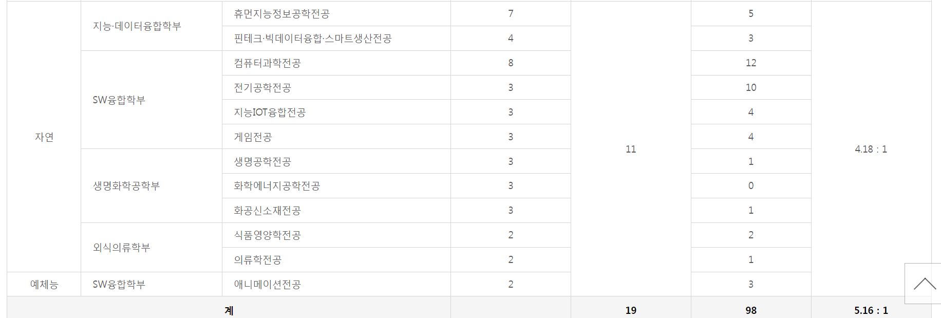 [나군] 수능(특성화고교졸업자전형) 역시도 인문, 자연&예체능을 나누어 학과를 통합해 학생을 모집했으며, 인문은 6.50:1, 자연&예체능은 4.18:1 이었습니다.