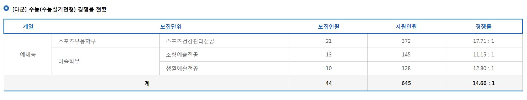 [다군] 수능(수능실기전형)에서는 스포츠건강관리전공, 조형예술전공, 생활예술전공의 신입생을 모집했으며, 스포츠건강관리전공의 경쟁률은 17.71:1, 조형예술전공의 경쟁률은 11.15:1, 생활예술전공의 경쟁률은 12.80:1 이었습니다.
