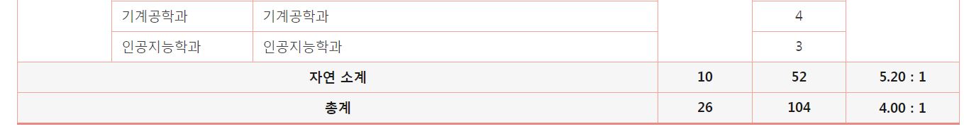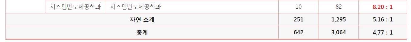 나군 수능(일반)전형에서 가장 경쟁률이 높았던 학과는 글로벌한국학부(11.00:1), 시스템반도체공학과(8.20:1), 인공지능학과(7.00:1) 순이었습니다.
