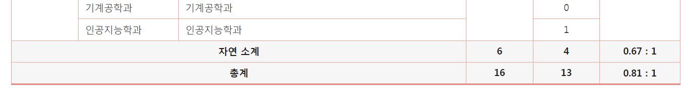 나군 수능(장애인대상자) 전형 역시 학과를 통합하여 모집했으며, 인문, 인문자연과 자연 모두 미달이었습니다.