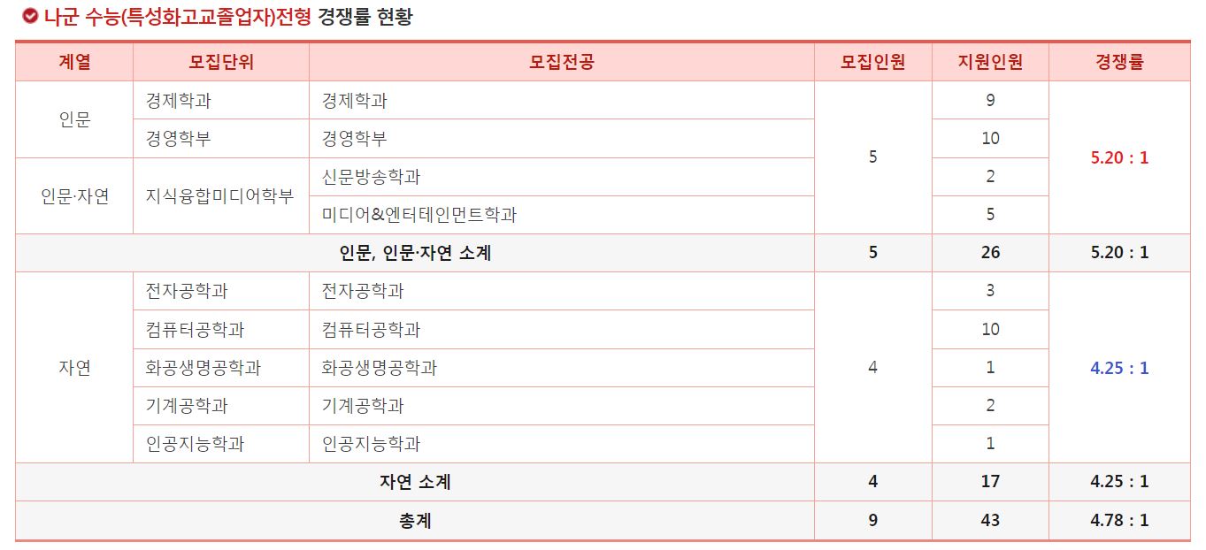 나군 수능(특성화고교졸업자) 전형 역시 인문, 인문자연과 자연을 각각 통합하여 학생을 모집했으며, 인문, 인문 자연의 경쟁률은 5.20:1, 자연은 4.25:1 이었습니다.