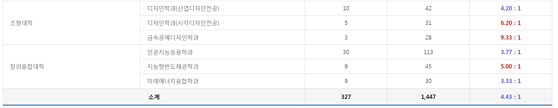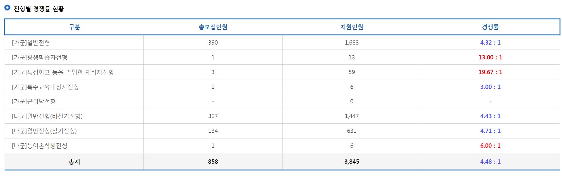 전체 경쟁률을 먼저 살펴보자면, 전형을 통틀어 올해 서울과학기술대학교의 경쟁률은 4.48:1 이었습니다.