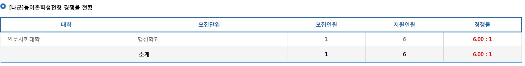 [나군]농어촌학생전형에서는 행정학과의 신입생을 모집했으며, 경쟁률은 6.00:1 이었습니다.