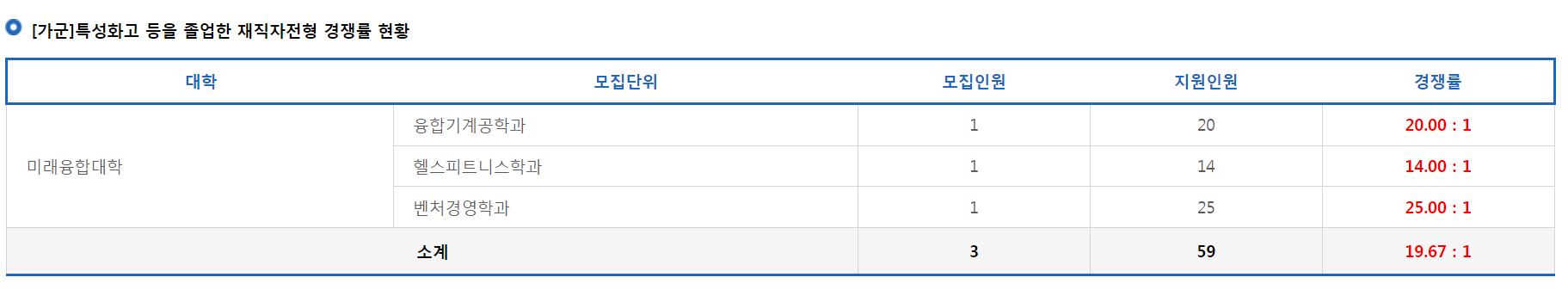[가군]특성화고 등을 졸업한 재직자전형에서는 융합기계공학과, 헬스피트니스학과, 벤처경영학과의 신입생을 모집했으며, 융합기계공학과의 경쟁률은 20.00:1, 헬스피트니스학과의 경쟁률은 14.00:1, 벤처경영학과의 경쟁률은 25.00:1 이었습니다.