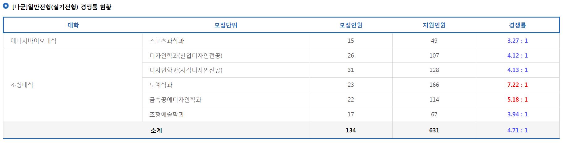[나군]일반전형(실기전형)에서 가장 경쟁률이 높았던 학과는 도예학과(7.22:1), 금속공예디자인학과(5.18:1), 디자인학과(시각디자인전공)(4.13:1) 순이었습니다.