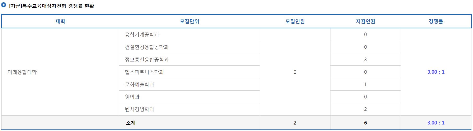 [가군]특수교육대상자전형에서는 학과를 통합하여 학생을 모집했으며, 경쟁률은 3.00:1 이었습니다.