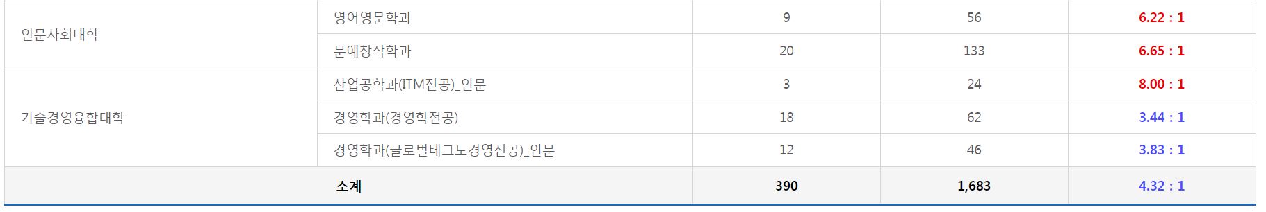 [가군]일반전형에서 가장 경쟁률이 높았던 학과는 경영학과(글로벌테크노경영전공)_자연(13.00:1), 산업공학과(ITM전공)_인문(8.00:1), 문예창작학과(6.65:1) 순이었습니다.