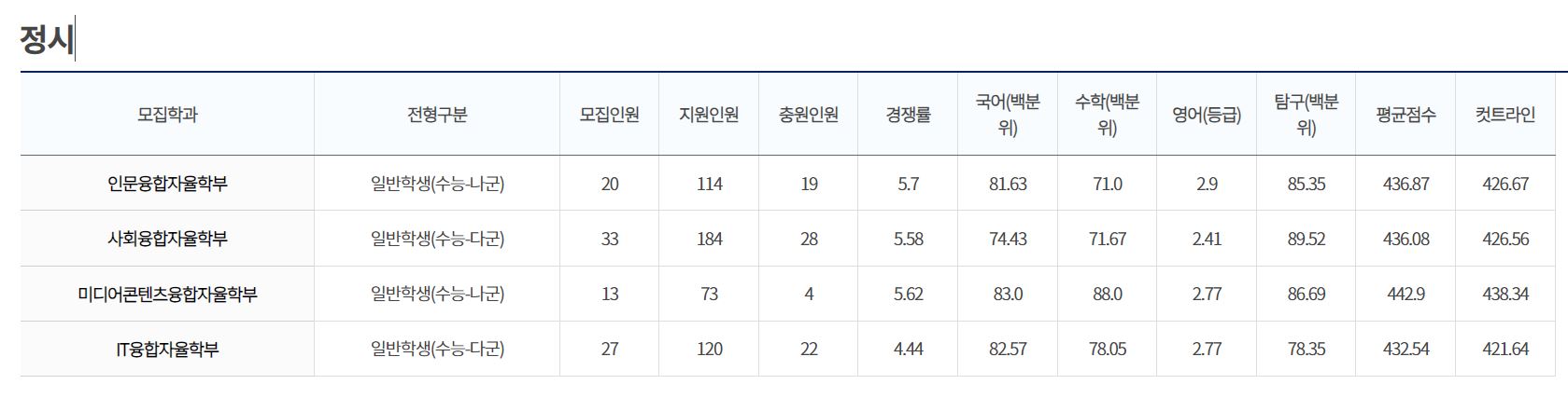 가장 경쟁률이 높았던 학과는 인문융합자율학부(5.7:1), 미디어콘텐츠융합자율학부(5.62:1), 사회융합자율학부(5.58:1) 순이었습니다.