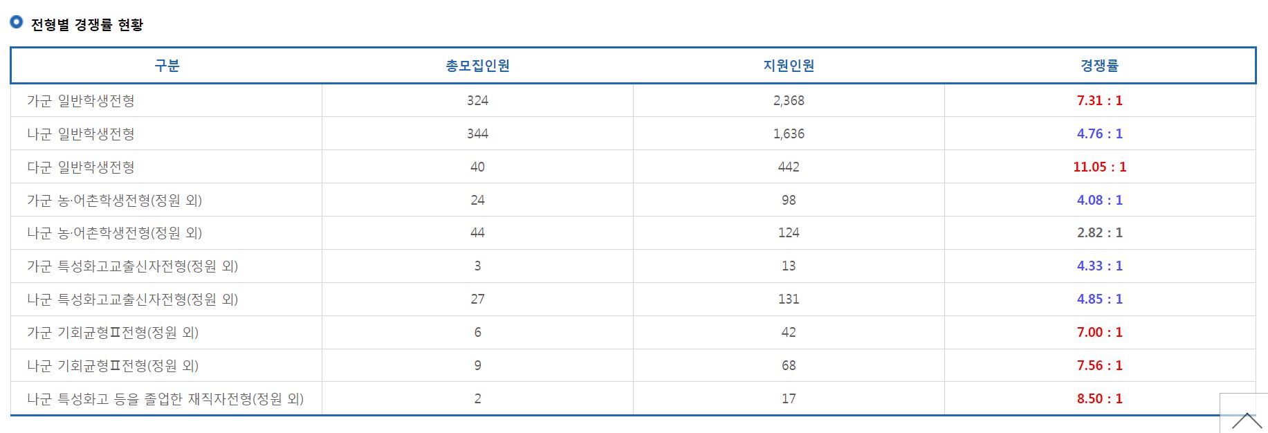 가군 농어촌학생전형(정원 외) 전형에서는 사범대, 간호학과, 이외의 학과로 나누어서 학생을 통합모집했으며, 간호학과의 경쟁률은 3.00:1, 사범대는 3.40:1, 이외의 학과 경쟁률은 4.60:1 이었습니다.