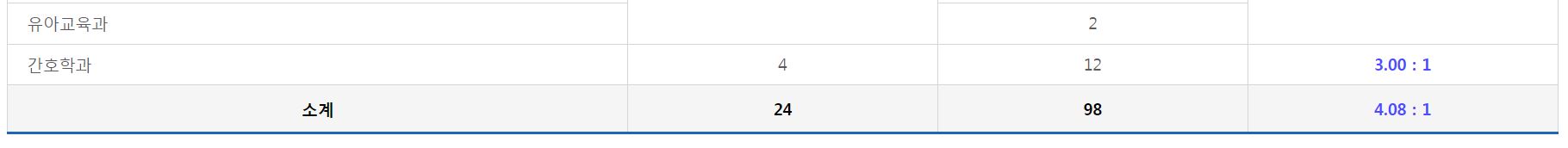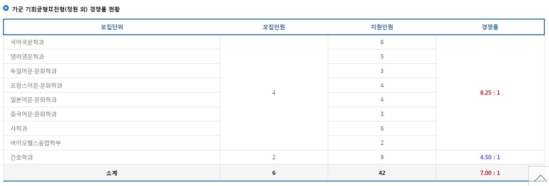 가군 기회균형2전형(정원 외)에서는 간호학과, 이외의 학과를 나누어 모집했으며, 간호학과의 경쟁률은 4.50:1, 이외의 학과 경쟁률은 8.25:1 이었습니다.