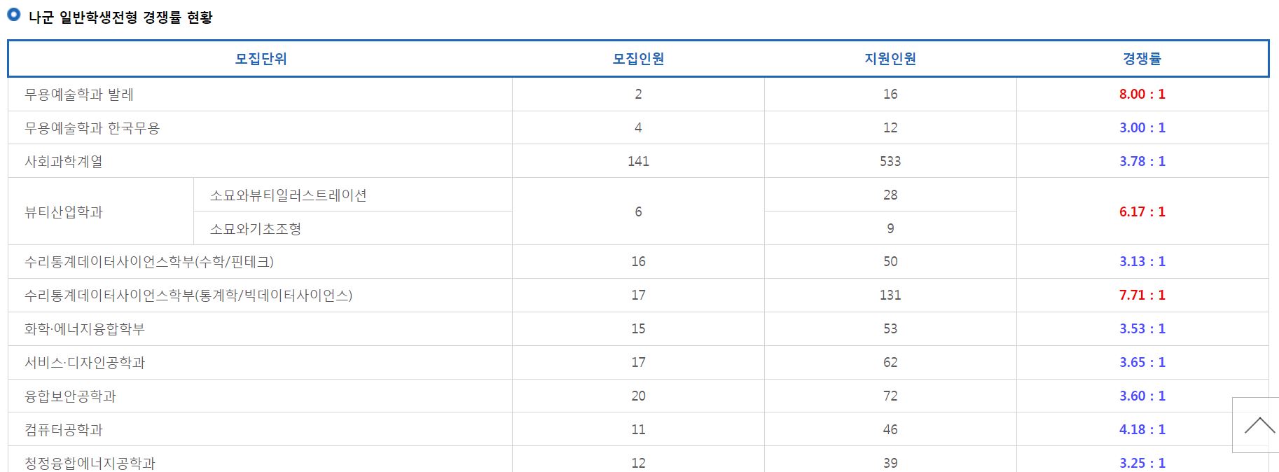 나군 일반학생전형에서 가장 경쟁률이 높았던 학과는 공예과(15.65:1), 무용예술학과 발레(8.00:1), 수리통계데이터사이언스학부(통계학/빅데이터사이언스)(7.71:1) 순이었습니다.