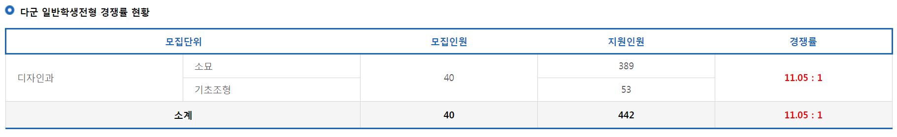 다군 일반학생전형에서는 디자인과의 신입생을 모집했으며, 경쟁률은 11.05:1 이었습니다.