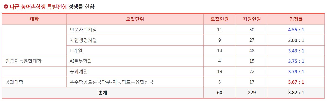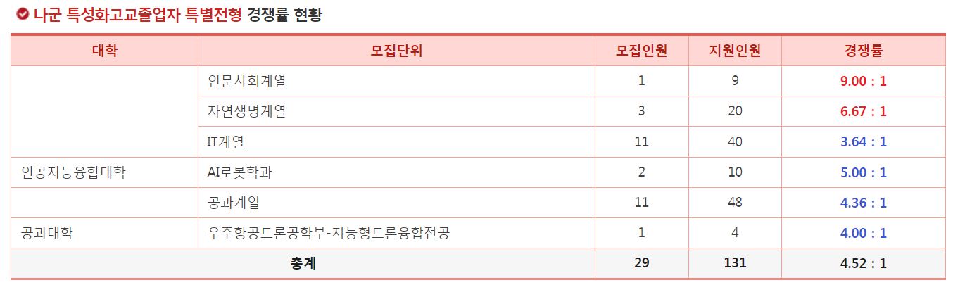 나군 농어촌학생 특별전형에서 가장 경쟁률이 높았던 학과는 우주항공드론공학부-지능형드론융합전공(5.67:1), 인문사회계열(4.55:1), 공과계열(3.79:1) 순이었습니다.