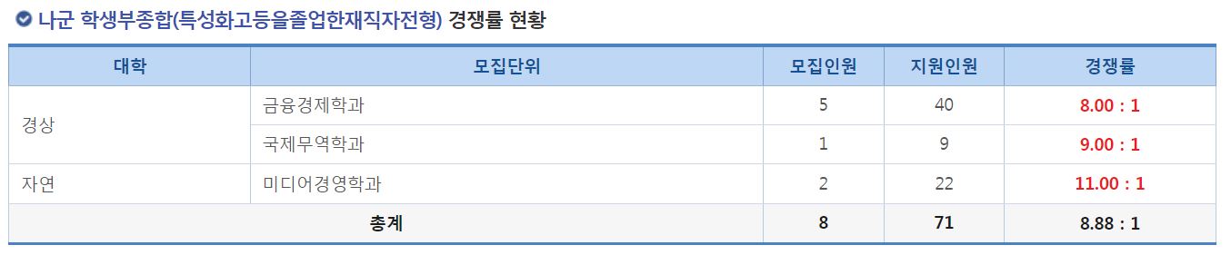 나군 학생부종합(특성화고등을졸업한재직자전형)에서는 금융경제학과, 국제무역학과, 미디어경영학과의 신입생을 모집했으며, 금융경제학과의 경쟁률은 8.00:1, 국제무역학과의 경쟁률은 9.00:1, 미디어경영학과의 경쟁률은 11.00:1 이었습니다.