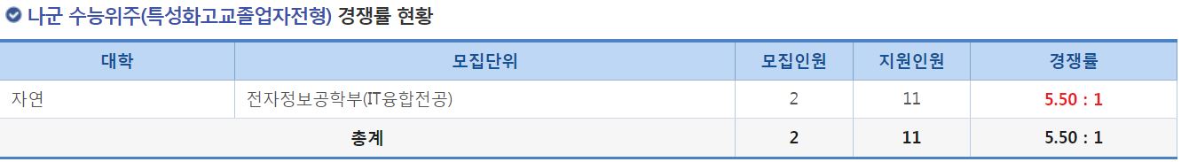 나군 수능위주(특성화고교졸업자전형)에서는 전자정보공학부(IT융합전공)의 신입생을 모집했으며, 경쟁률은 5.50:1 이었습니다.