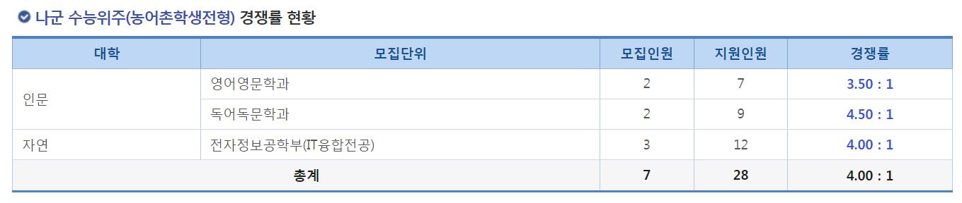 나군 수능위주(농어촌핛애전형)에서는 영어영문학과, 독어독문학과, 전자정보공학부(IT융합전공)의 신입생을 모집했으며, 영어영문학과의 경쟁률은 3.50:1, 독어독문학과의 경쟁률은 4.50:1, 전자정보공학부(IT융합전공)의 경쟁률은 4.00:1 이었습니다.