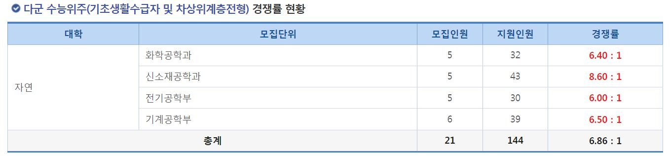 다군 수능위주(기초생활수급자 및 차상위계층전형) 경쟁률 현황