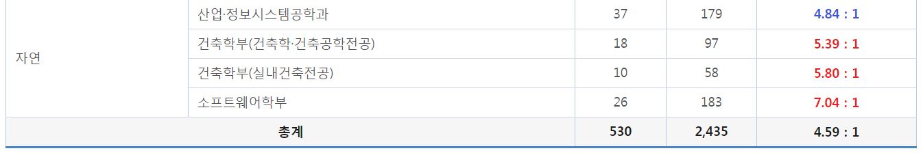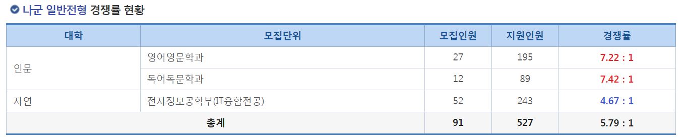 나군 일반전형에서는 영어영문학과, 독어독문학과, 전자정보공학부(IT융합전공)의 신입생을 모집했으며, 영어영문학과의 경쟁률은 7.22:1, 독어독문학과의 경쟁률은 7.42:1, 전자정보공학부(IT융합전공)의 경쟁률은 4.67:1 이었습니다.
