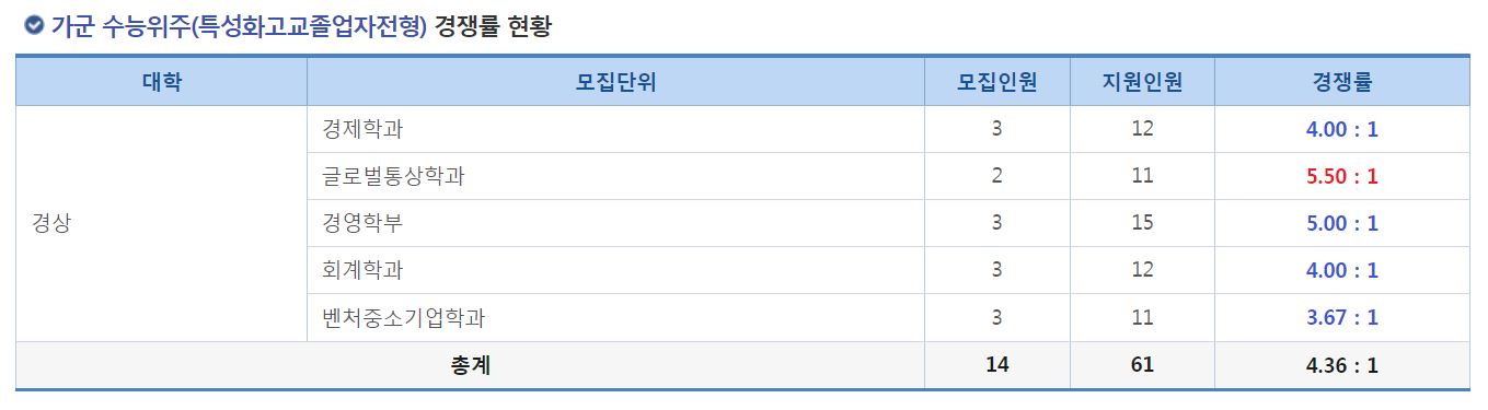 가군 수능위주(특성화고교졸업자전형)에서 가장 경쟁률이 높았던 학과는 글로벌통상학과(5.50:1), 경영학부(5.00:1), 경제학과(4.00:1), 회계학과(4.00:1) 순이었습니다.