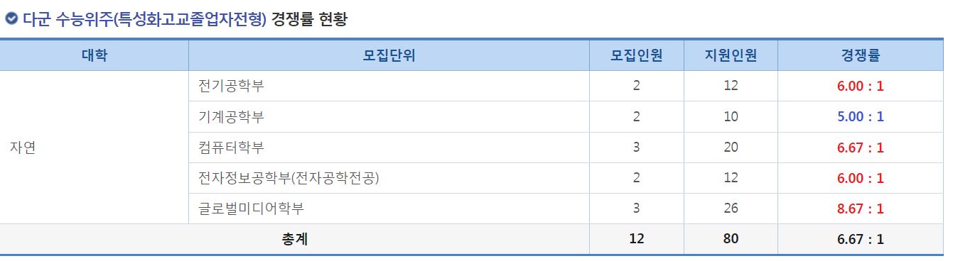 다군 수능위주(특성화고교졸업자전형)에서 가장 경쟁률이 높았던 학과는 글로벌미디어학부(8.67:1), 컴퓨터학부(6.67:1), 전기공학부(6.00:1), 전자정보공학부(전자공학전공)(6.00:1) 순이었습니다.