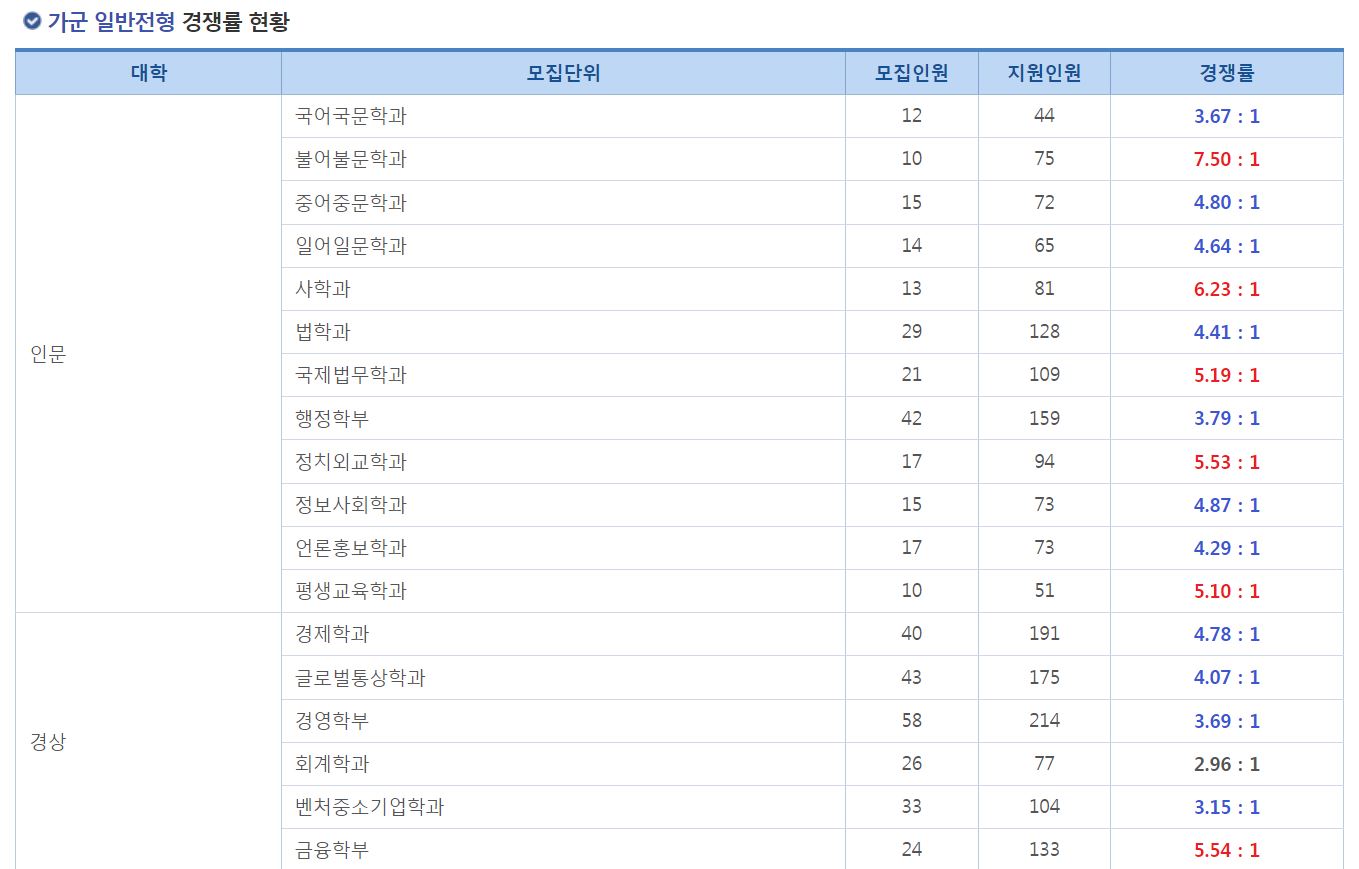 가군 일반전형에서 가장 경쟁률이 높았던 학과는 불어불문학과(7.50:1), 소프트웨어학부(7.04;1), 사학과(6.23:1) 순이었습니다.