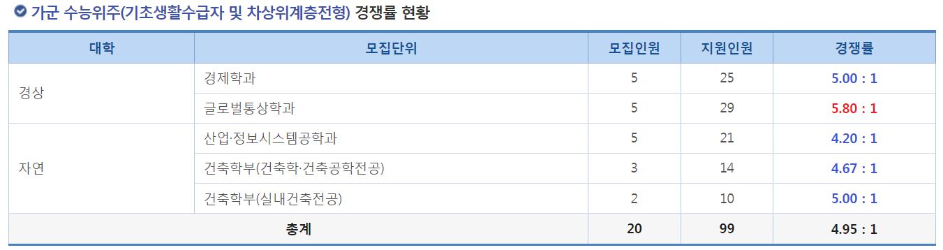 가군 수능위주(기초생활수급자 및 차상위계층전형)에서 가장 경쟁률이 높았던 학과는 글로벌통상학과(5.80:1), 경제학과(5.00:1), 건축학부(실내건축전공)(5.00:1) 순이었습니다.