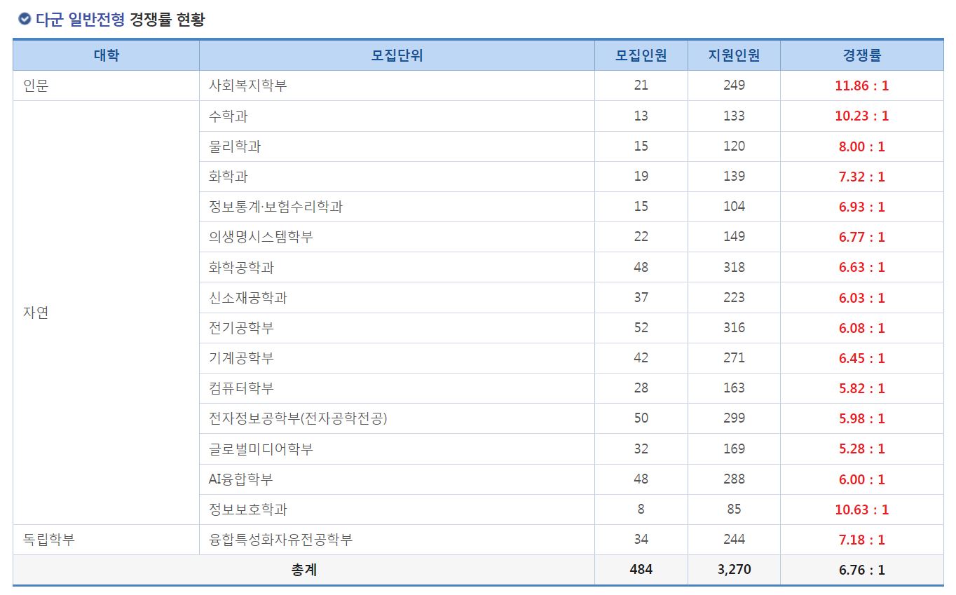 다군 일반전형에서 가장 경쟁률이 높았던 학과는 사회복지학부(11.86:1), 정보보호학과(10.63:1), 수학과(10.23:1) 순이었습니다.