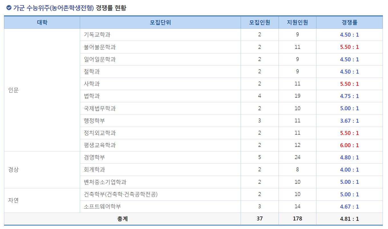 가군 수능위주(농어촌학생전형) 경쟁률 현황