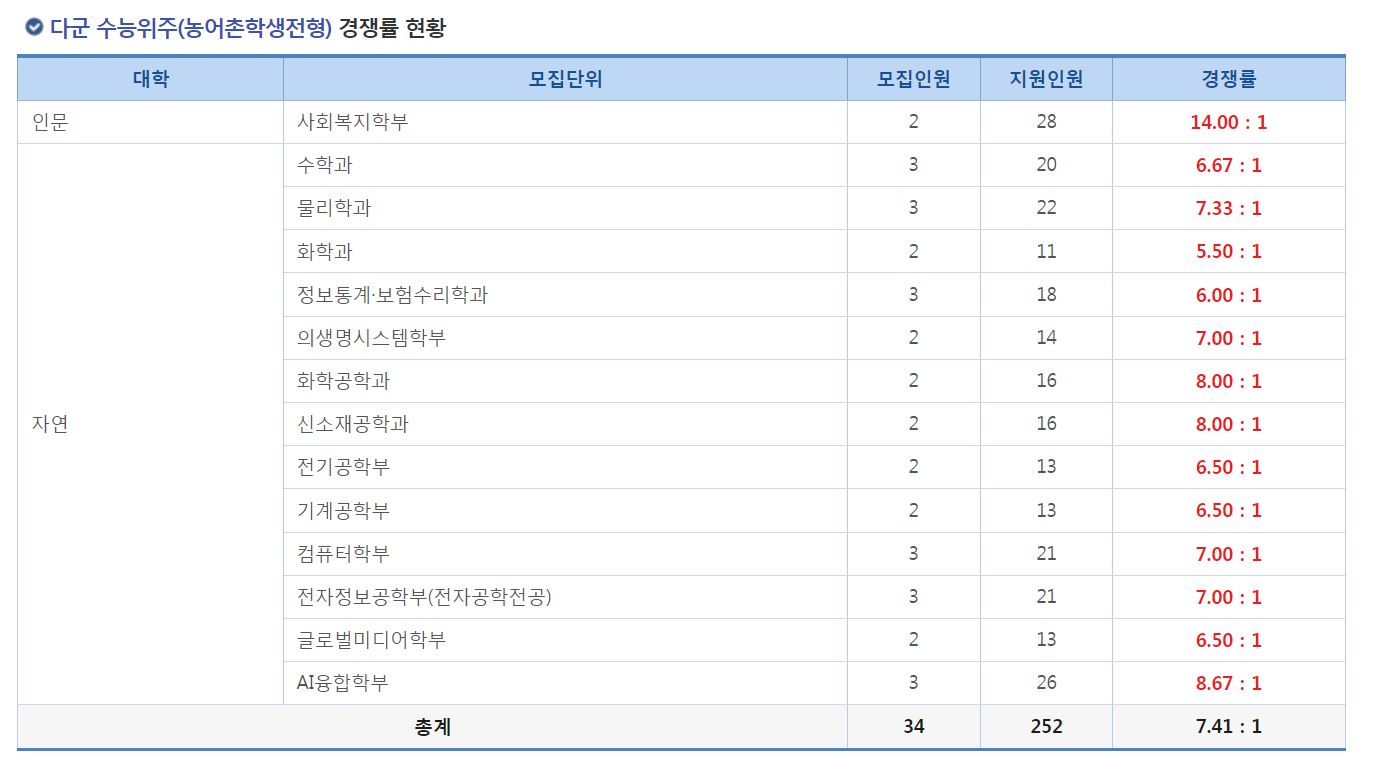 다군 수능위주(농어촌학생전형) 경쟁률 현황