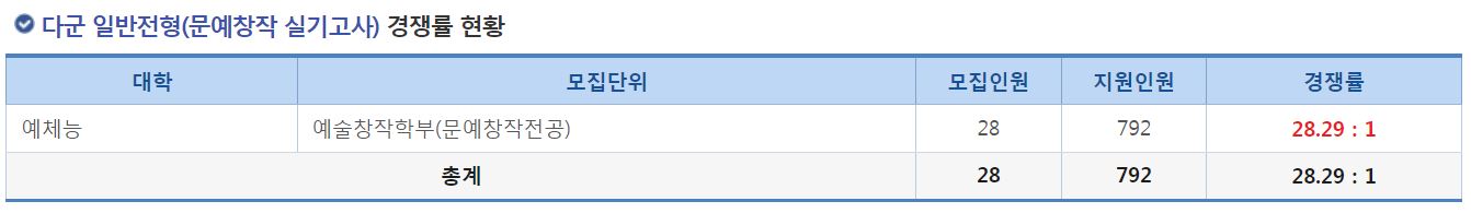다군 일반전형(문예창작 실기고사)에서는 예술창작학부(문예창작전공)의 신입생을 모집했으며, 경쟁률은 28.29:1 이었습니다.