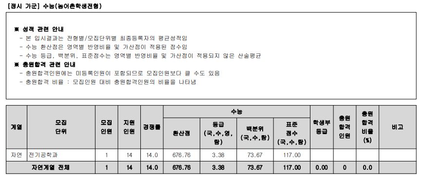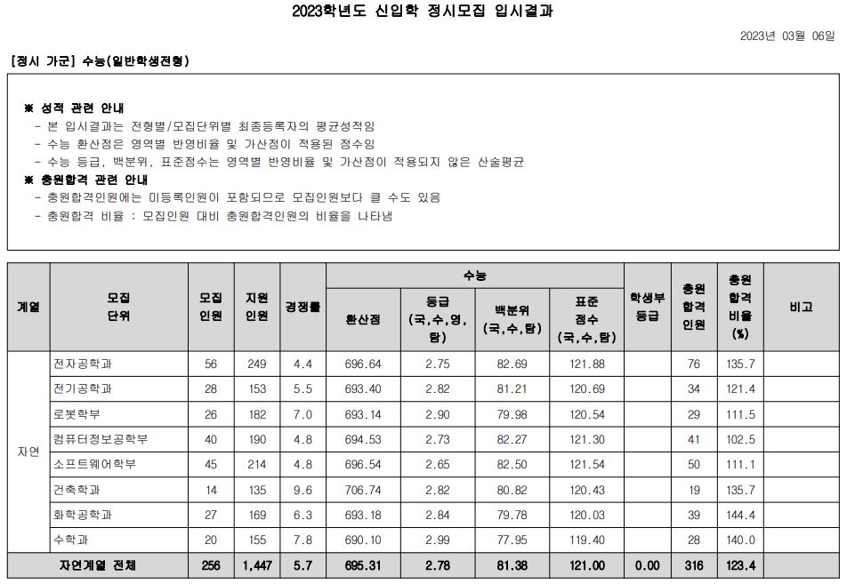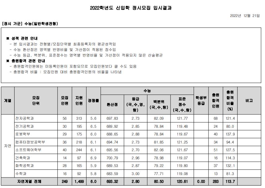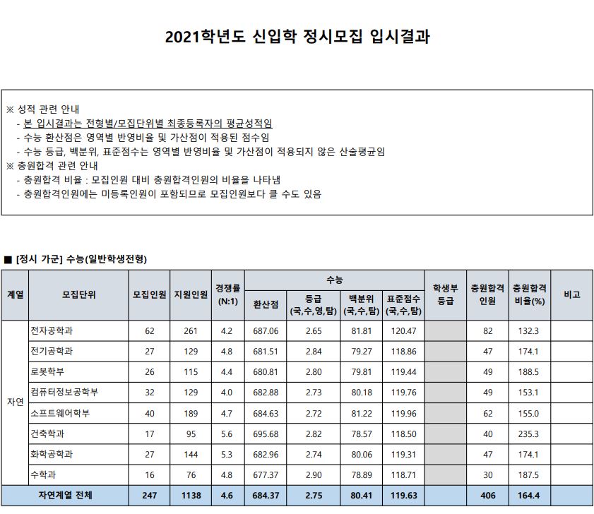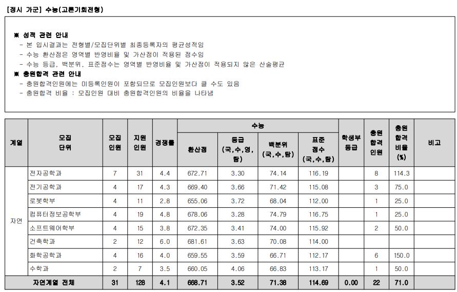 가군 : 전자공학과, 전기공학과, 로봇학부, 컴퓨터정보공학부, 소프트웨어학부, 건축학과, 화학공학과, 수학과