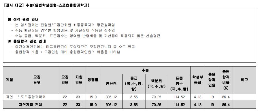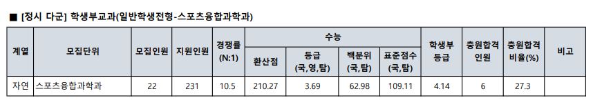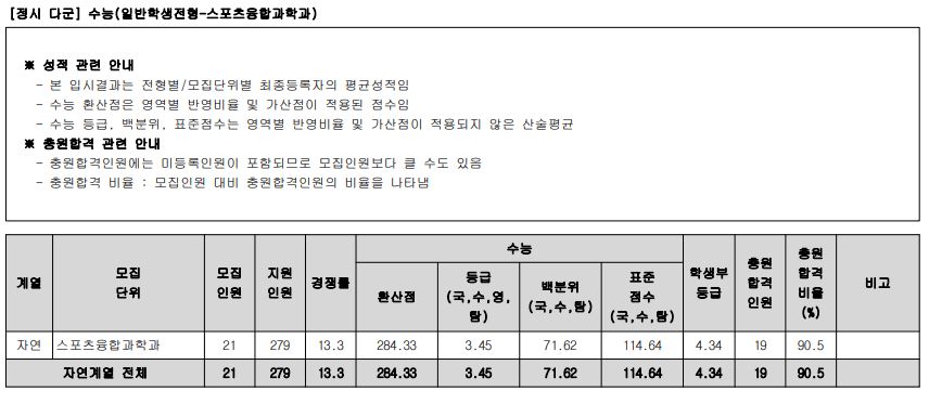 가장 경쟁률이 높았던 학과는 스포츠융합과학과(10.5:1), 국제학부(8.9:1), 환경공학과(8.2:1) 순이었습니다.