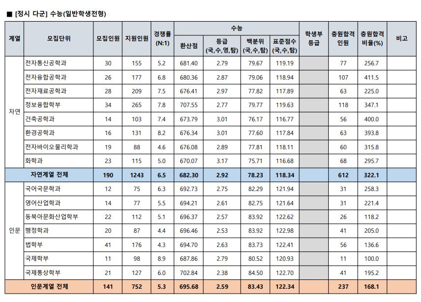 다군 : 전자통신공학과, 전자융합공학과, 전자재료공학과, 정보융합학부, 건축공학과, 환경공학과, 전자바이오물리학과, 화학과, 국어국문학과, 영어산업학과, 동북아문화산업학부, 행정학과, 법학부, 국제학부, 국제통상학부, 스포츠융합과학과