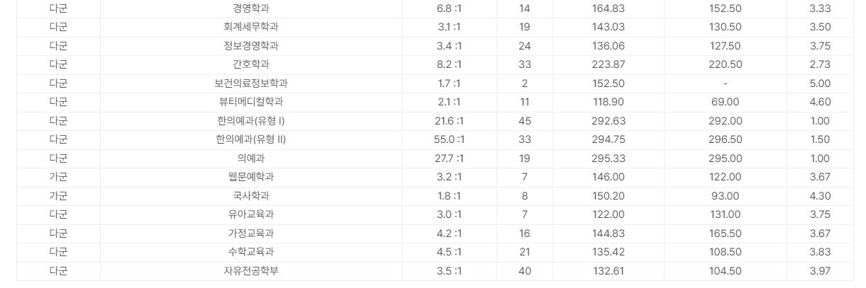 다군 : 바이오제약공학과, 조경정원디자인학부, 항공서비스무역학과, 호텔관광외식경영학부, 행정경찰공공학부, 사회복지학과, 경영학과, 회계세무학과, 정보경영학과, 간호학과, 보건의료정보학과, 뷰티메디컬학과, 한의예과(유형 1), 한의예과(유형 2), 의예과, 유아교육과, 가정교육과, 수학교육과, 자유전공학부