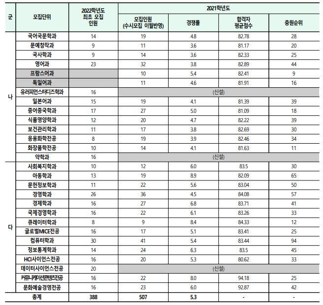 다군 : 경영학전공, 국제경영학전공, 경제학전공, 문헌정보학전공, 사회복지학전공, 아동학전공, 컴퓨터학전공, 정보통계학전공, 큐레이터학전공, 커뮤니케이션콘텐츠전공, 커뮤니케이션콘텐츠전공, 문화예술경영전공, 글로벌MICE전공, HCI사이언스전공, 데이터사이언스전공, 회화전공(한국화), 회화전공(서양화), 디지털공예전공, 피아노전공, 관현악전공(바이올린), 관현악전공(비올라), 관현악전공(첼로), 관현악전공(더블베이스), 관현악전공(관악/타악기), 성악전공, 패션디자인전공(주간), 시각&실내디자인전공(시각), 시각&실내디자인전공(실내), 미디어디자인전공, 패션디자인전공(야간)