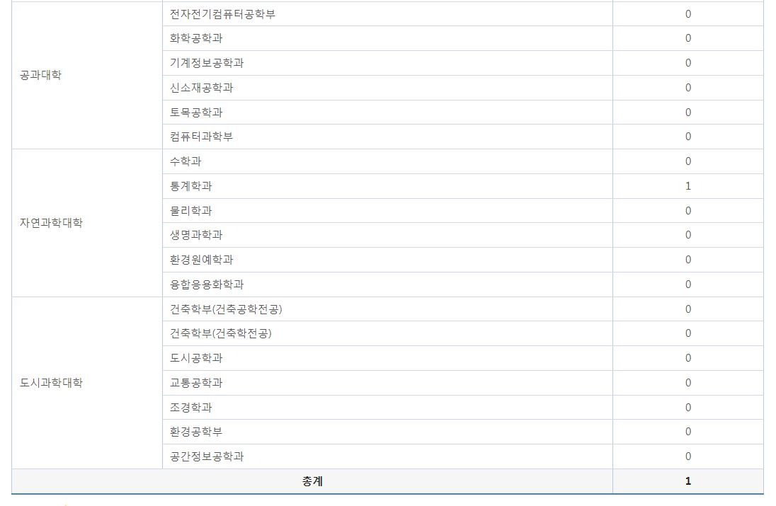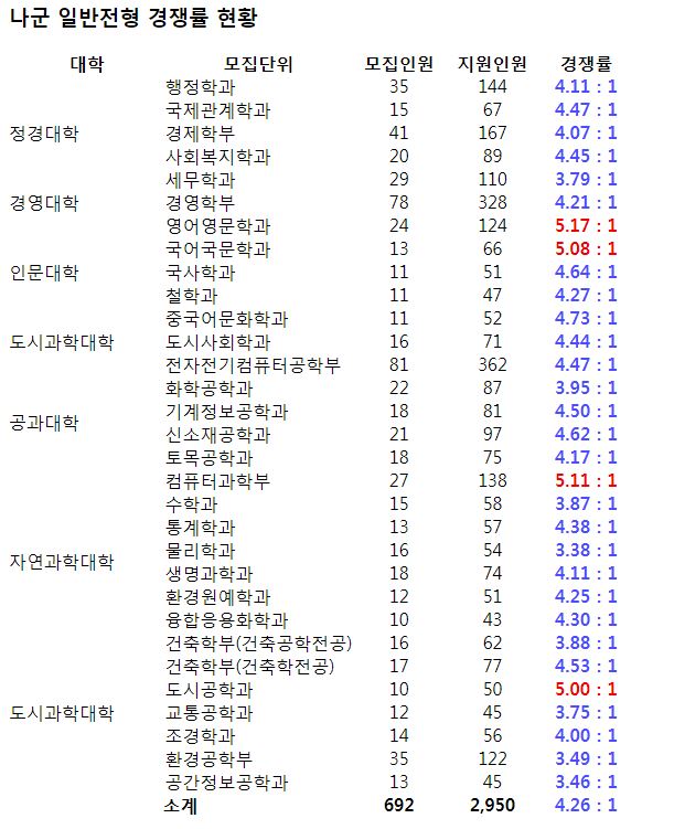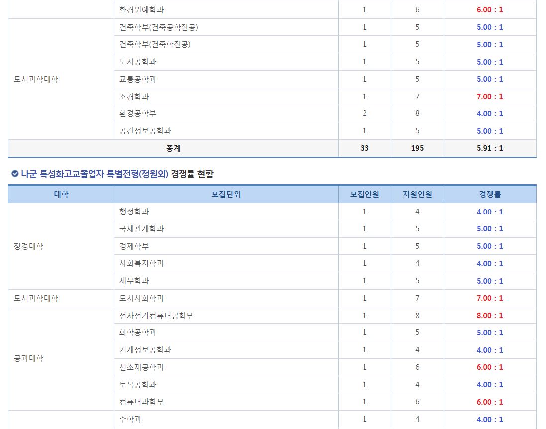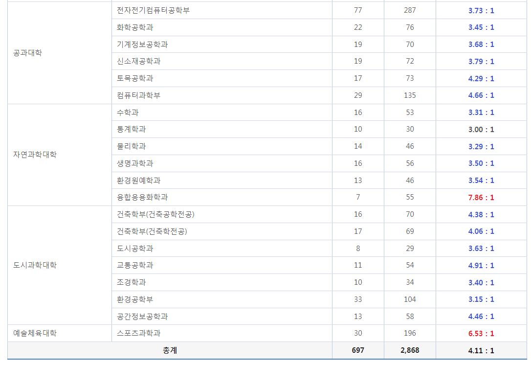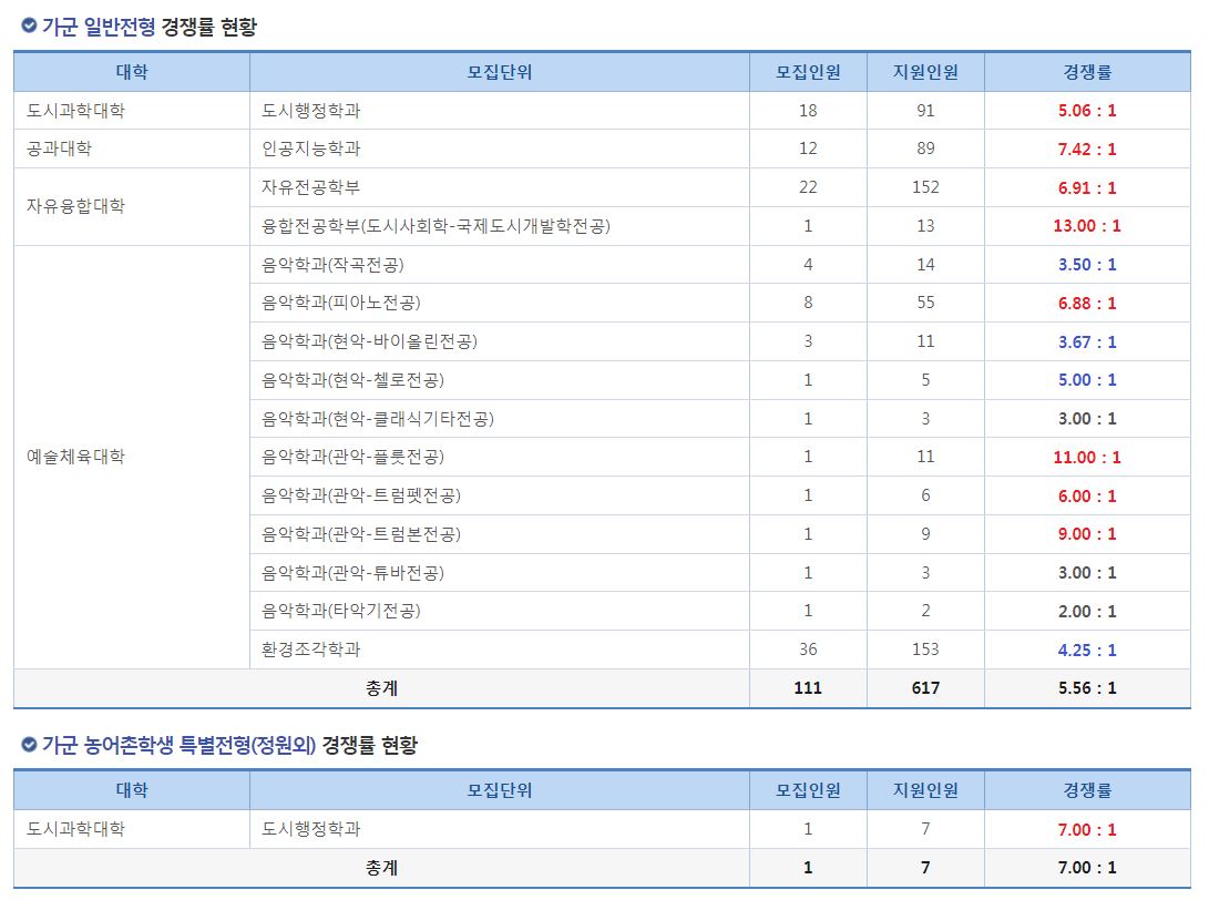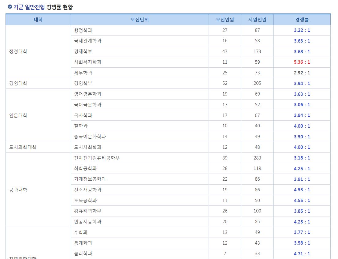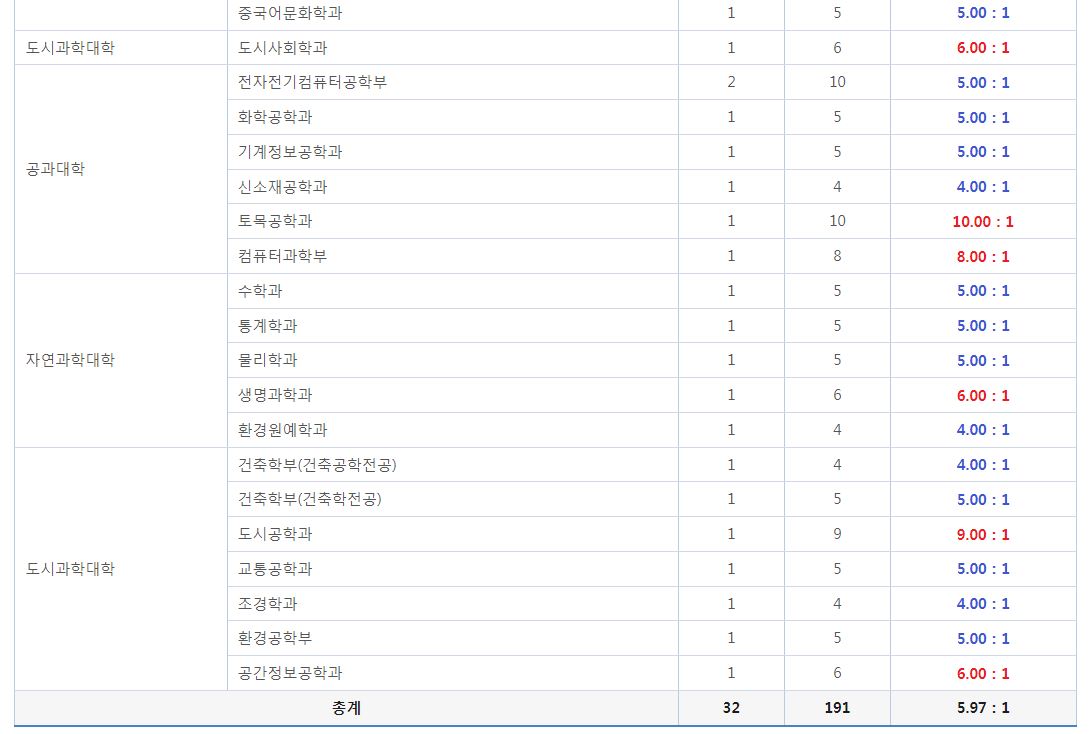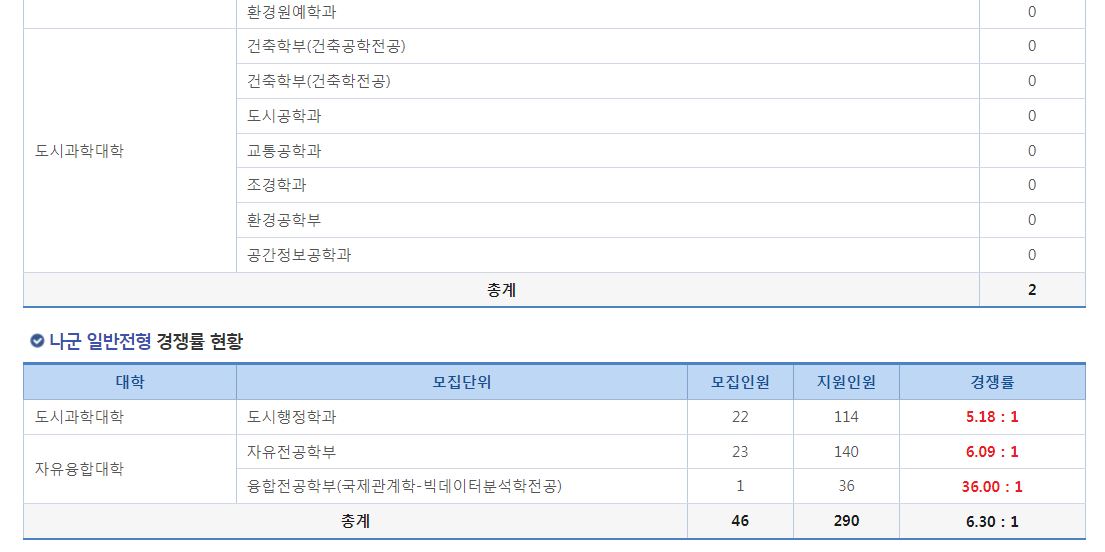 서울시립대학교는 지난 모집 군을 따로 공개하고 있지 않기 때문에 경쟁률을 위주로 자료를 보도록 하겠습니다.