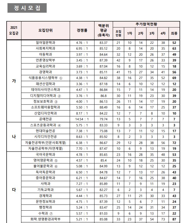 가군 : 일어일문학과, 사회복지학과, 아동학과, 언론영상학부, 교육심리학과, 경영학과, 식품응용시스템학부, 패션산업학과, 데이터사이언스학과, 디지털미디어학과, 정보보호학과, 소프트웨어융합학과, 산업디자인학과, 공예전공