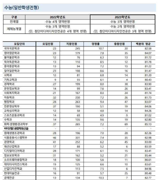 2022학년도에 가장 경쟁률이 높았던 학과는 국어국문학과(10.7:1), 공예전공(10.3:1), 수학과(9.6:1) 순이었습니다.