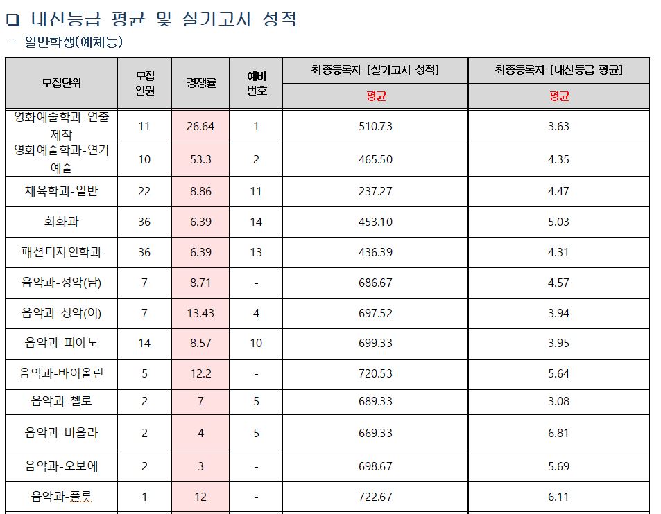 2021학년도에 가장 경쟁률이 높았던 학과는 영화예술학과-연기예술(53.3:1), 영화예술학과-연출제작(26.64:1), 음악과-성악(여)(13.43:1) 순이었습니다.