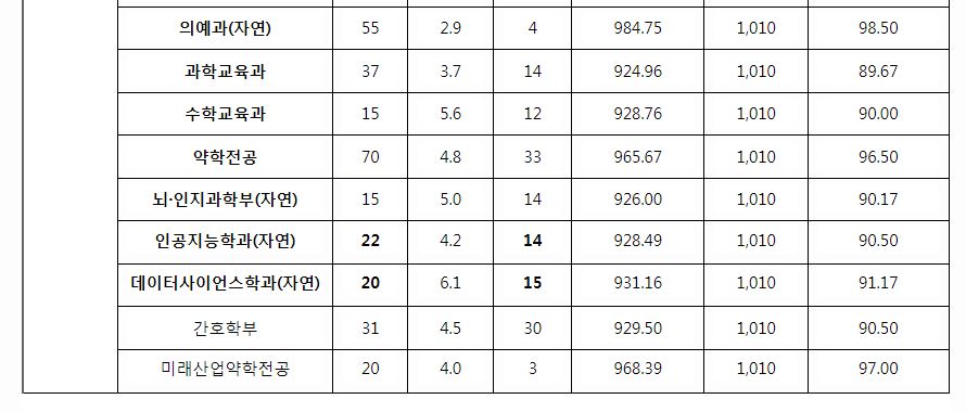 가장 경쟁률이 높았던 학과는 뇌인지과학부(인문)(10.6:1), 인공지능학과(인문)(8.6:1), 교육학과(8.1:1) 순이었습니다.