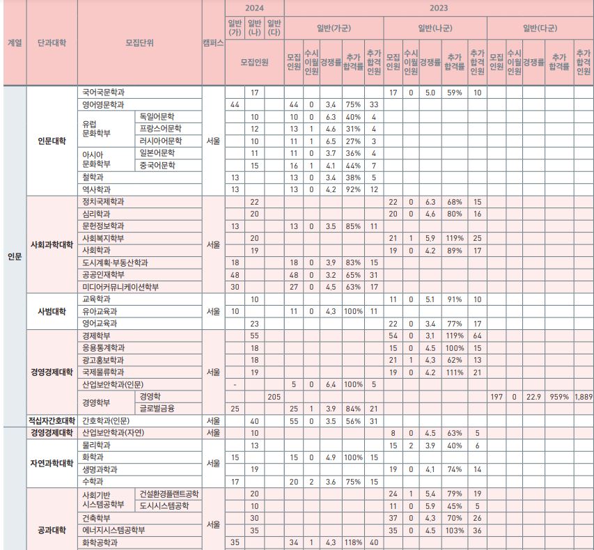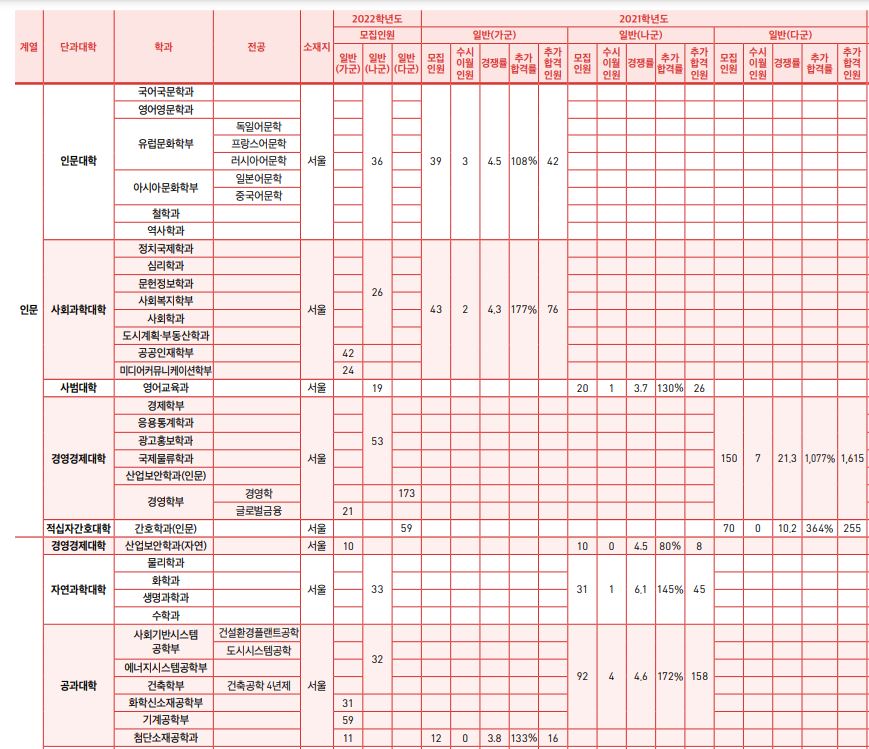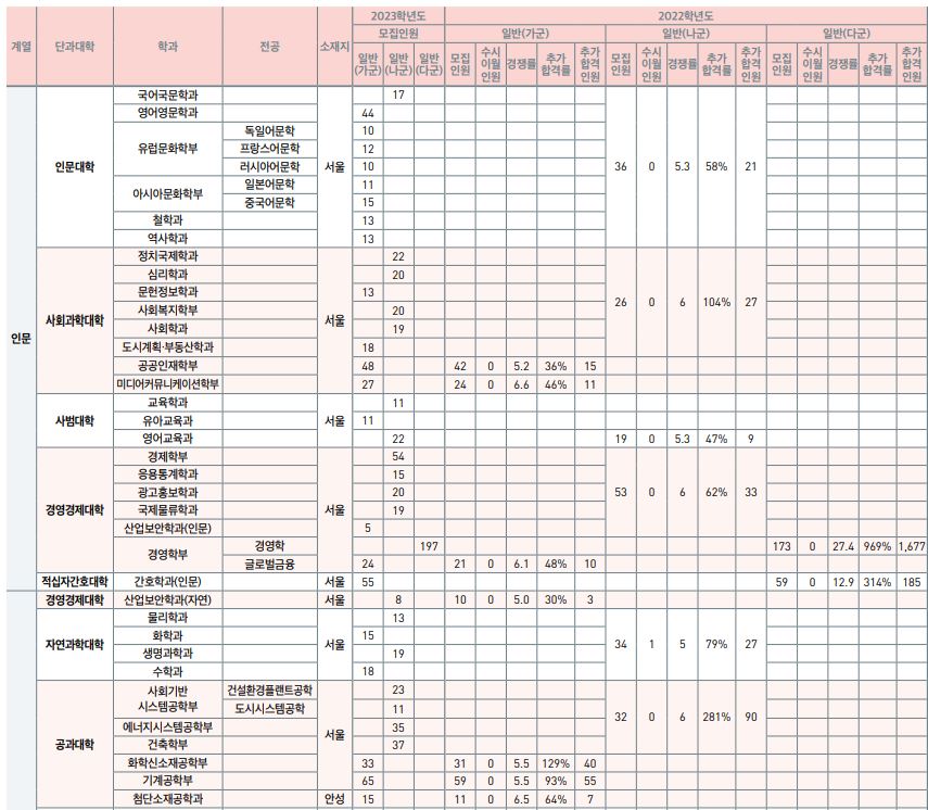 가군 : 영어영문학과, 유럽문화학부(독일어문학), 유럽문화학부(프랑스어문학), 유럽문화학부(러시아어문학), 아시아문화학부(일본어문학), 아시아문화학부(중국어문학), 철학과, 역사학과, 문헌정보학과, 도시계획부동산학과, 공공인재학부, 미디어커뮤니케이션학부, 유아교육과, 경영학부(글로벌금융), 화학과, 수학과, 화학신소재공학부, 기계공학부, 첨단소재공학과, AI학과, 약학부, 간호학과(자연), 생명자원공학부(동물생명공학), 생명자원공학부(식물생명공학), 식품공학부(식품공학), 식품공학부(식품영양), 시스템생명공학과, 디자인학부(공예), 디자인학부(산업디자인), 디자인학부(시각디자인), 디자인학부(실내환경디자인), 디자인학부(패션), 미술학부(한국화), 미술학부(서양화), 미술학부(조소), 디자인학부(공예), 디자인학부(산업디자인), 디자인학부(시각디자인), 디자인학부(실내환경디자인), 디자인학부(패션), 음악예술(가야금), 음악예술(거문고), 음악예술(해금), 음악예술(대금), 음악예술(피리), 음악예술(작곡(실용음악) 지휘), 음악예술(음악학 예술경영)