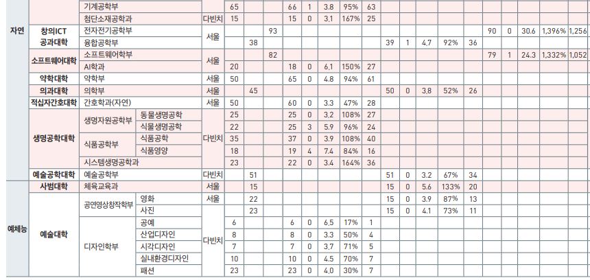 가군 : 영어영문학과, 철학과, 역사학과, 문헌정보학과, 도시계획부동산학과, 공공인재학부, 미디어커뮤니케이션학부, 유아교육과, 경영학부(글로벌금융), 화학과, 수학과, 화학공학과, 기계공학부, 첨단소재공학과, AI학과, 약학부, 간호학과9자연), 생명자원공학부(동물생명공학), 생명자원공학부(식물생명공학), 식품공학부(식품공학), 식품공학부(식품영양), 시스템생명공학과, 디자인학부(공예), 디자인학부(시각디자인), 디자인학부(실내환경디자인), 디자인학부(패션), 미술학부(한국화), 미술학부(서양화), 미술학부(조소), 디자인학부(공예), 디자인학부(산업디자인), 디자인학부(시각디자인), 디자인학부(실내환경디자인), 디자인학부(패션)
