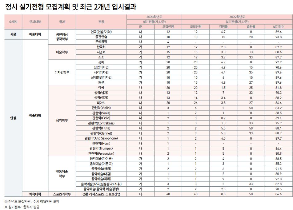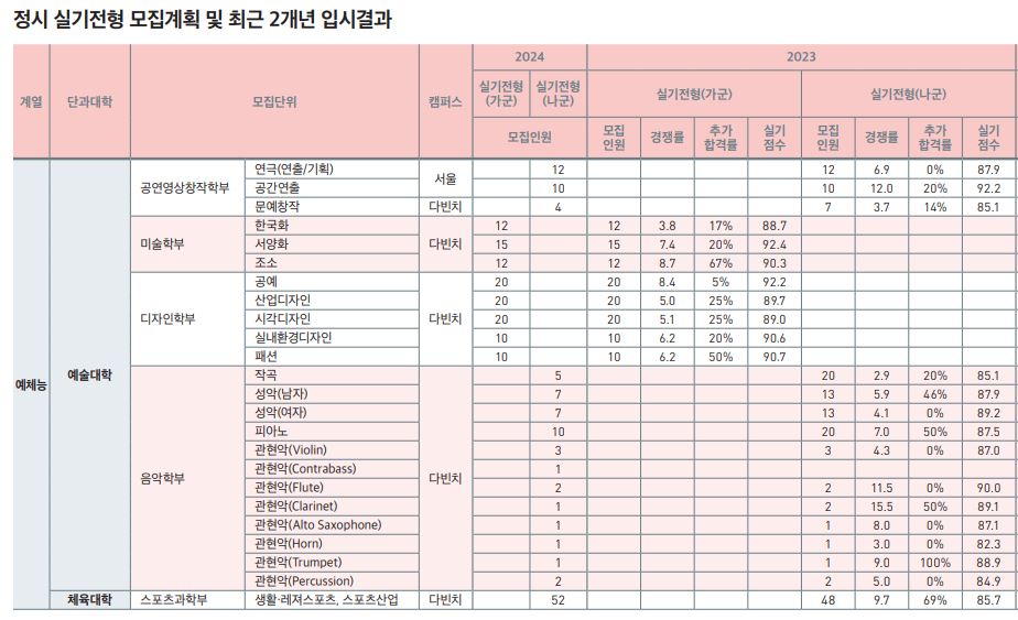 나군 : 국어국문학과, 유럽문화학부(독일어문학), 유럽문화학부(프랑스어문학), 유럽문화학부(러시아어문학), 아시아문화학부(일본어문학), 아시아문화학부(중국어문학), 정치국제학과, 심리학과, 사회복지학부, 사회학과, 교육학과, 영어교육과, 경제학부, 응용통계학과, 광고홍보학과, 국제물류학과, 간호학과(인문), 산업보안학과9자연), 물리학과, 생명과학과, 사회기반시스템공학부(건설환경플랜트공학), 사회기반시스템공학부(도시시스템공학), 건축학부, 에너지시스템공학부, 융합공학부, 의학부, 예술공학부, 체육교육과, 공연영상창작학부(영화), 공연영상창작학부(사진), 공연영상창작학부(연극(연출/기획)), 공연영상창작학부(공간연출), 공연영상창작학부(문예창작), 음악학부(작곡), 음악학부(성악(남자)), 음악학부(성악(여자)), 음악학부(피아노), 음악학부(관현악(Violin)), 음악학부(관현악(Contrabass)), 음악학부(관현악(Flute)), 음악학부(관현악(Clarinet)), 음악학부(관현악(Alto Saxophone)), 음악학부(관현악(Horn)), 음악학부(관현악(Trumpet)), 음악학부(관현악(Percussion)), 스포츠과학부(생활-레져스포츠,스포츠산업))