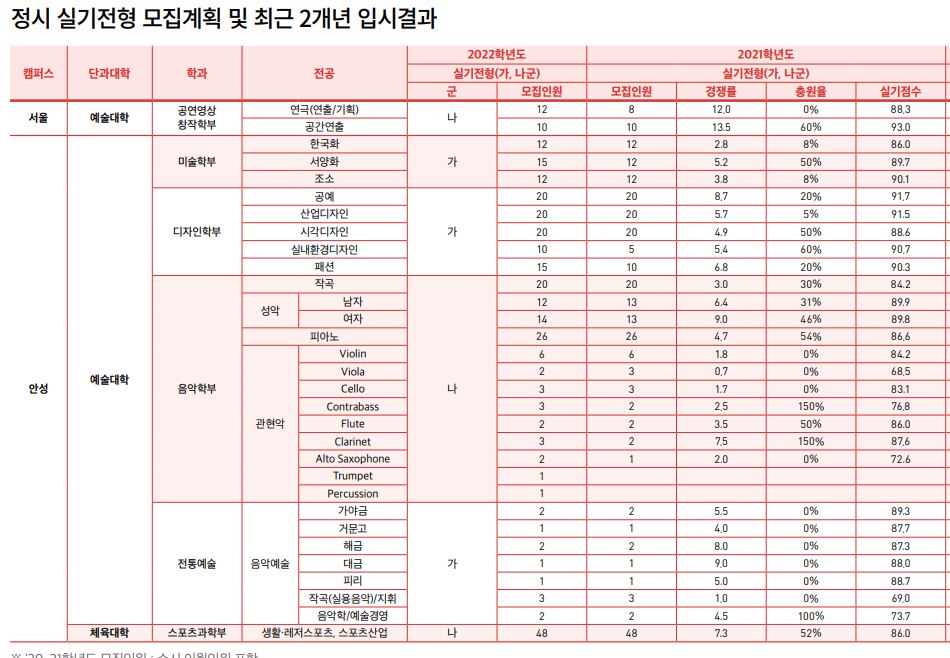 나군 : 인문대학, 사회과학대학(공공인재학부, 미디어커뮤니케이션학부 제외), 영어교육과, 경제경영대학(경영학부 제외), 자연과학대학, 공과대학(사회기반시스템공학부, 에너지시스템공학부, 건축학부), 의학부, 예술공학부, 체육교육과, 공연영상창작학부(영화), 공연영상창작학부(사진), 음악학부(작곡), 음악학부(성악(남자)), 음악학부(성악(여자)), 음악학부(피아노), 음악학부(관현악(Violin)), 음악학부(관현악(Viola)), 음악학부(관현악(Cello)), 음악학부(관현악(Contrabass)), 음악학부(관현악(Flute)), 음악학부(관현악(Clarinet)), 음악학부(관현악(Alto Saxophone)), 음악학부(관현악(Trumpet)), 음악학부(관현악(Percussion))