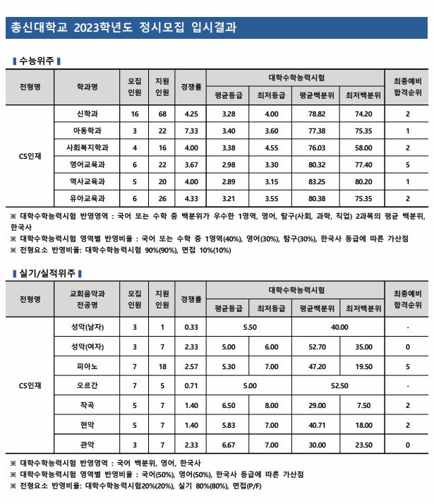 총신대학교에서는 이전 정시 모집 군을 공개하고 있지 않기 때문에, 경쟁률을 중심으로 자료를 살펴보도록 하겠습니다.