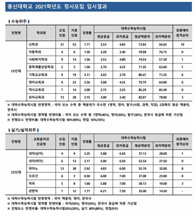 2021학년도 총신대학교의 오르간 학과는 미달이었으며, 이외의 학과 중 가장 경쟁률이 높았던 학과는 피아노(2.92:1), 영어교육과(2.56:1), 성악(여자(2.17:1) 순이었습니다.