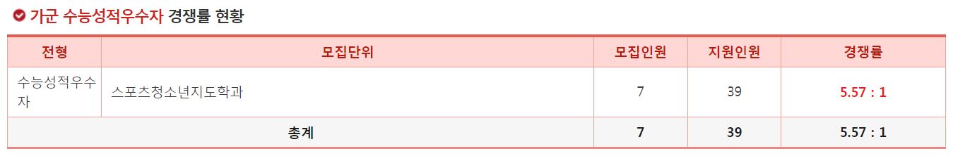 가군 수능성적우수자전형엥서는 스포츠청소년지도학과의 신입생을 모집했으며, 경쟁률은 5.57:1 이었습니다.